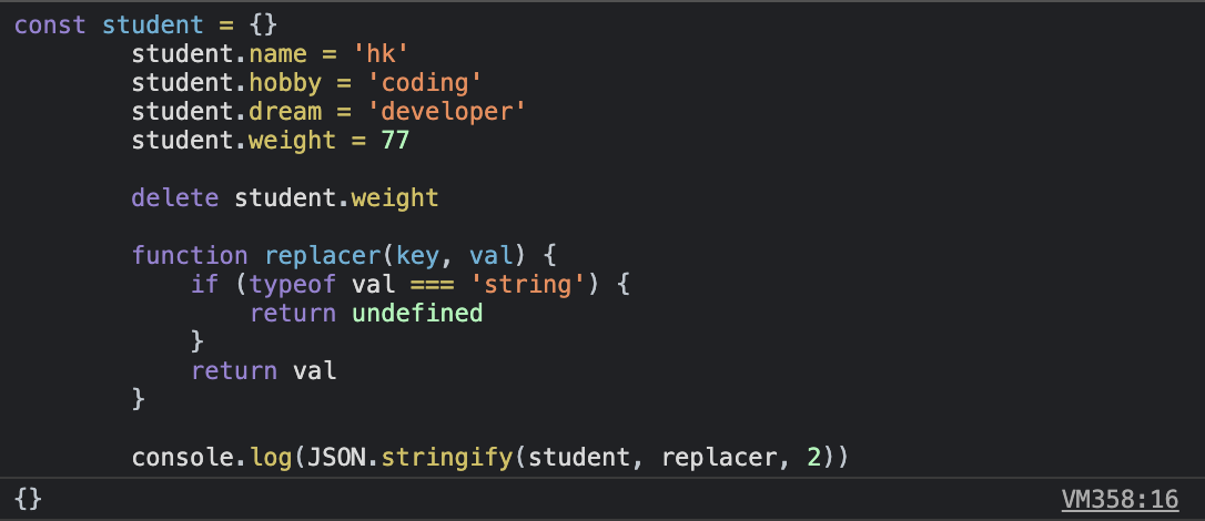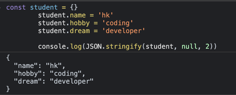 여기서 JSON.stringify(val, replacer, space) 메소드는 객체를 콘솔에서 쉽게 볼 수 있는 방법 중 하나다.
