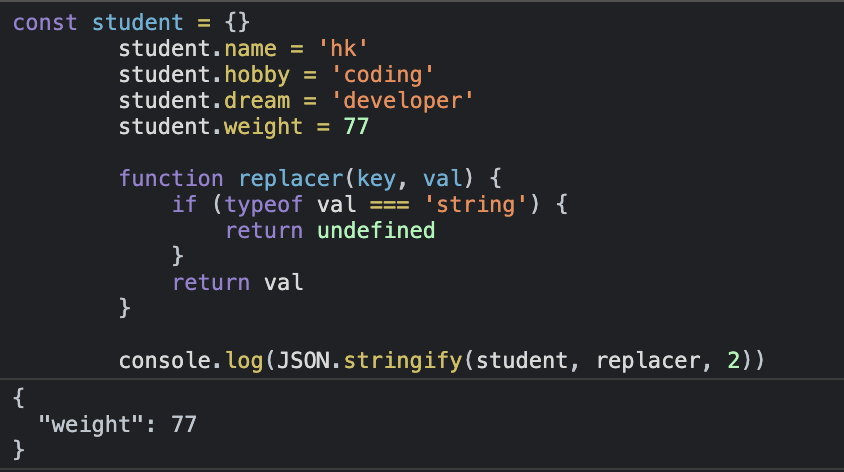 replacer에는 함수나 배열이 올 수 있는데, 함수가 오면 해당 함수를 거치게 되고, 배열이 오면 해당 배열에 속하는 키값만 출력된다.